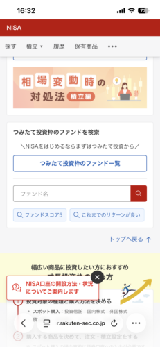 Webでログインして、NISAを選んだら、スクロールして下の方にある、「つみたて投資枠のファンド一覧」を開きます。