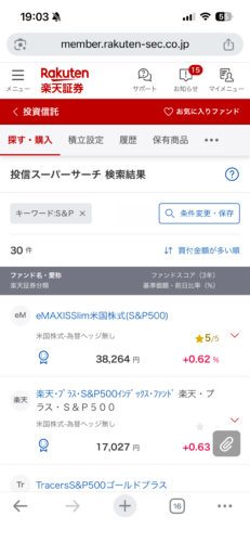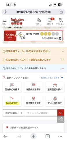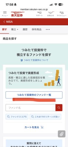 私はPCからではなく、iPhoneからアクセスしましたので画像は以下の、🔍銘柄・ファンドを探すの、「NISAで探す」ボタンから入ります。