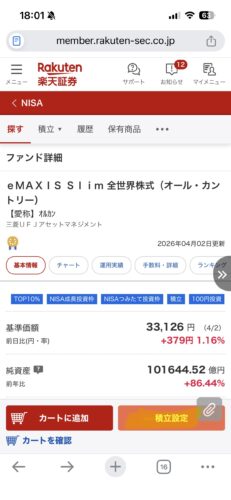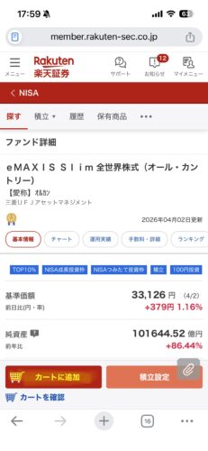 次の画面、「カートに追加」ボタンと、「積立設定」ボタンの2つがありますが、