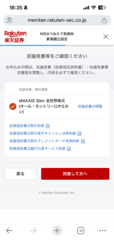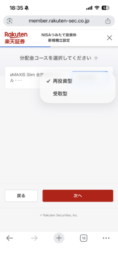 この後は積立金額を設定して、分配金コースは再投資型、目論見書等に目を通してどんどん進みます。