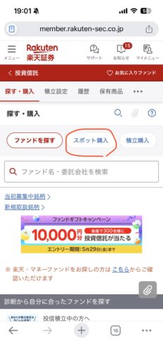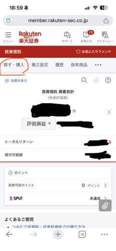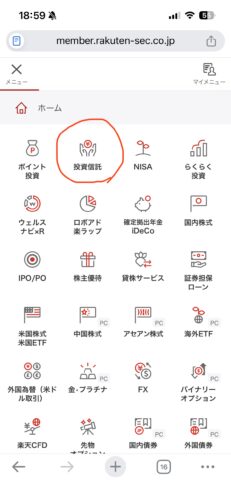 左上の3本線のメニューから、「投資信託」を押すと、右の画像(汚くてすみません)に進みますので、