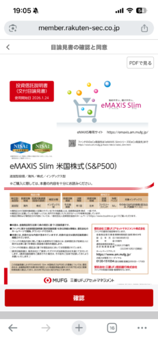 eMAXIS Slim米国株式(S&P500 )を選択して、「購入」ボタンを押すと、目論見書の確認と同意という画面に移るので同意して進めて、金額を設定して、どこから入金するかを設定します。