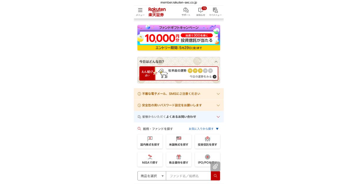 私はPCからではなく、iPhoneからアクセスしましたので画像は以下の、🔍銘柄・ファンドを探すの、「NISAで探す」ボタンから入ります。
